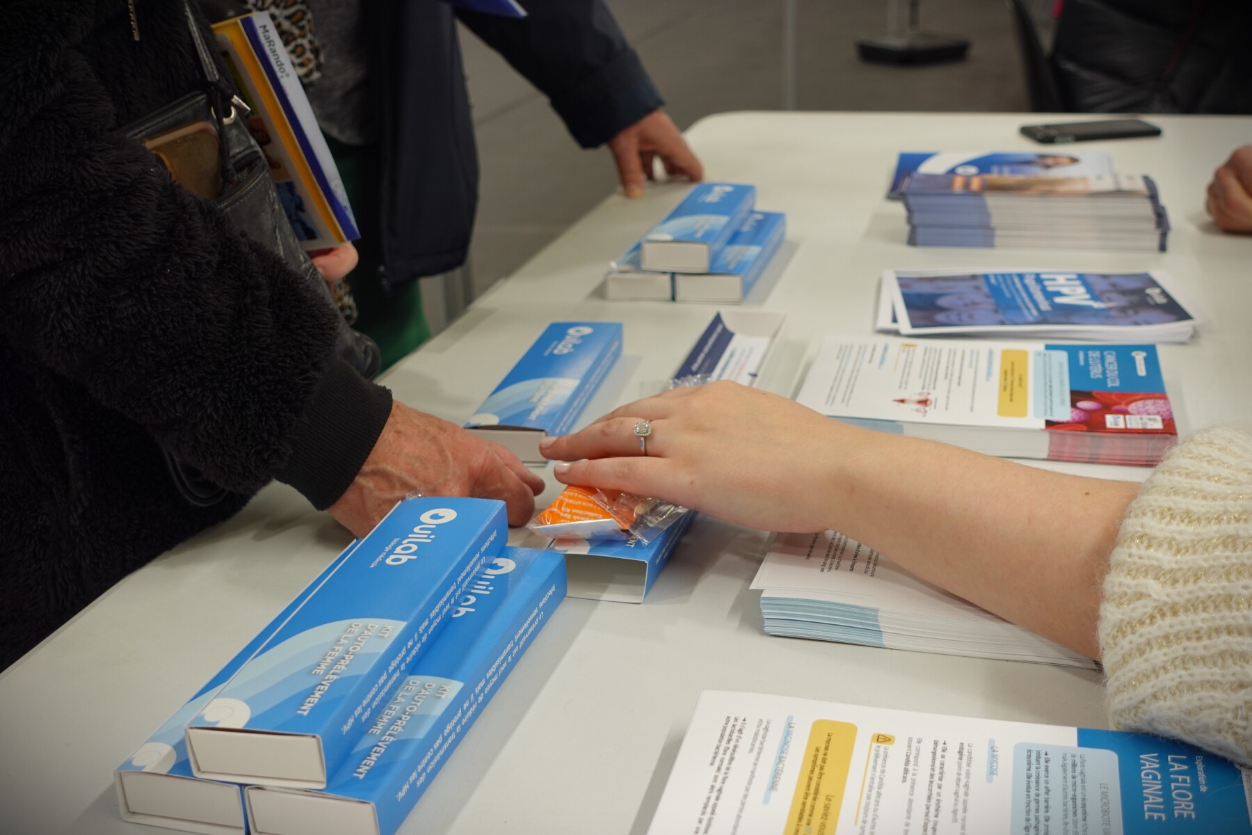 Ce dispositif, disponible dans les laboratoires OuiLab, permet aux femmes de réaliser elles-mêmes un premier prélèvement, en toute simplicité. Des kits d’auto prélèvement étaient proposés sur notre stand, et plusieurs visiteuses sont reparties avec un exemplaire, curieuses de découvrir cette alternative.