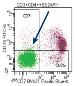 Les résultats indiquent par ailleurs que chez plus de la moitié des patients, une fraction ≥ 30% des TCD4+ bénins (non Sézary) n’exprime pas le CD26. Ceci est problématique lors du suivi de ces patients, la numération des TCD4+CD26- pouvant sous-estimer la réponse sanguine aux traitements.