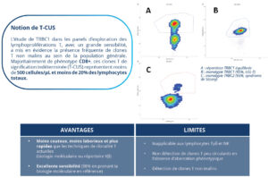 La cytométrie en flux joue un rôle essentiel dans l’exploration biologique d’un syndrome lymphoprolifératif T en mettant en évidence une anomalie de répartition des sous populations (expansion, isolée ou non), et/ou des aberrations phénotypiques.