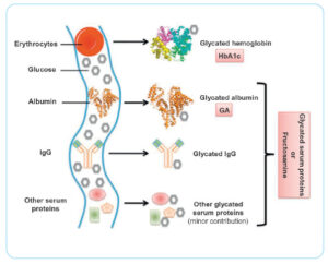 La glycation de l’hémoglobine se produit à l’intérieur des érythrocytes. Toutes les protéines sériques subissent une glycation par le glucose, symbolisée par des hexagones gris. L’albumine et les IgG sont les plus importantes car elles ont une demivie longue et sont présentes en fortes concentrations. Le total combiné de toutes les protéines sériques modifiées par le glucose correspond aux fructosamines.