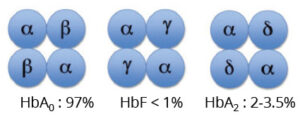 L’hémoglobine est le principal constituant des globules rouges. Il s’agit d’un tétramère formé de 2 chaînes protéiques identiques deux à deux. On distingue 3 types d’hémoglobine :