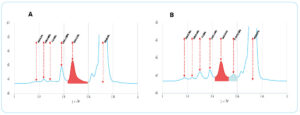 En technique HPLC, les résultats sont interprétés à l’aide d’un chromatogramme représentant les différents constituants de l’hémoglobine. La détection d’un pic supplémentaire ou d’une déformation d’un pic peut indiquer la présence d’un variant de l‘hémoglobine (ex ci-dessous).