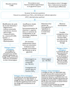 Logigramme de conduites à tenir en cas de résultats d’HbA1c « douteux », atypiques ou incohérents avec la clinique ou le suivi de la glycémie.
