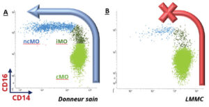 Cette technique brevetée permet d’évaluer la maturation des monocytes circulants dans le sang périphérique (image A). Chez le sujet sain, les cMO sont largement prédominants (85%-90% des monocytes totaux). La population de monocytes CD16+ (iMO et ncMO) est augmentée dans divers processus inflammatoires, infectieux ou néoplasiques et diminue le plus souvent après traitement de la cause initiale. A l’inverse dans la LMMC, nous identifions un blocage de maturation entrainant une accumulation de cMO (image B).